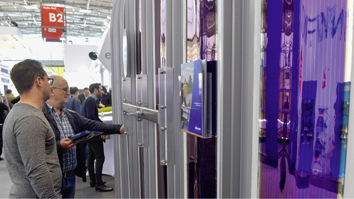 So sind auf der Messe jede Menge Hersteller von bauwerkintegrierten Solarlösungen vertreten. Die Bandbreite umfasst Modulhersteller mit den verschiedensten Technologien. Denn nicht nur kristalline Module und Dünnschichtpaneele sind hier vertreten. Auch die organische Photovoltaik, integrierbar in Baumaterialien, ist präsent.