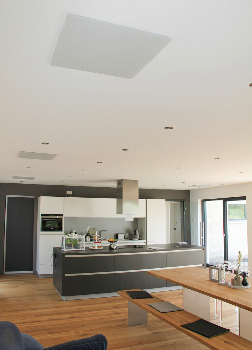 Als die Eigentümer das Fertighaus das erste Mal besichtigten, hatte es noch eine Luft-Wasser-Wärmepumpe. Dann schwenkte der Anbieter auf Infrarotheizungen um. Dem Paar gefiel die angenehme Wärme, zudem war das Infrarotheizsystem 9.000 Euro günstiger. Diese Summe investierten sie in eine Photovoltaikanlage mit 6,5 Kilowatt Leistung.