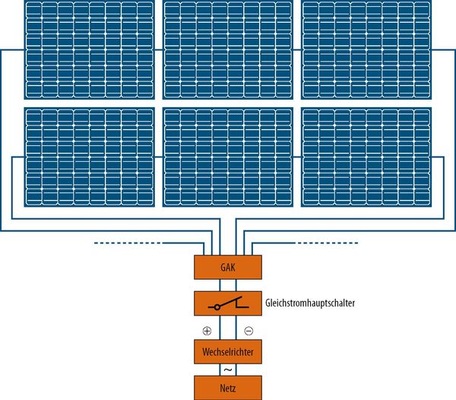 Auch bei Zentralwechselrichtern mit niedriger Systemspannung wird der gesamte Solargenerator nur mit einem zentralen Wechselrichter betrieben. Die Module des Solargenerators sind allerdings überwiegend parallel verschaltet zu einer kombi nierten Reihen- und Parallelverschaltung mit wenigen Modulen pro Reihenschaltung im String. Diese Verschaltung ist vorteilhaft bei Modulen mit unterschiedlichen elektrischen Kennwerten oder bei unterschiedlichen Einstrahlungsbedingungen der Module.