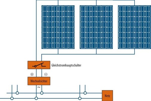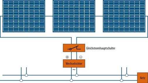 Beim Zentralwechselrichterkonzept werden alle Module – also der gesamte Solargenerator – auf einen Wechselrichter ver schaltet. Bei vielen Photovoltaikanlagen ist es aber notwendig oder einfach sinnvoller, die Solarmodule auf mehrere String- oder Multistringwechselrichter aufzuteilen, beispielsweise bei größeren Anlagenleistungen, bei Teilverschattungen oder bei unterschiedlichen Ausrichtungen und Neigungen der Solarmodule innerhalb des Solargenerators. Dabei hat ein Wechselrichter verschiedene Aufgaben zu erfüllen:. Der Wechselrichter wandelt den von den Solarmodulen gelieferten Gleichstrom in netzkonformen Wechselstrom um. Je nach Größe der Photovoltaikanlage erfolgt die Umwandlung in einphasigen Wechselstrom mit 230 Volt Nennspannung oder – bei größeren Anlagen – in Dreiphasenwechselstrom (Drehstrom) mit 400 Volt Nennspannung.