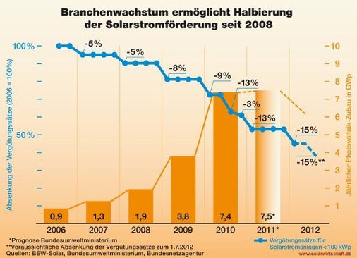 Insgesamt sind nach Angaben der Bundesnetzagentur im vierten Quartal 2011 rund 4150 Megawatt Photovoltaik-Leistung in Deutschland neu installiert worden. Dieser Wert würde bereits eine weitere Degression der Photovoltaik-Einspeisetarife von zwölf Prozent nach sich ziehen. Wenn zwischen Januar und April 2012 nun noch Anlagen mit einer Gesamtleistung von etwa 225 Megawatt installiert würden, dann sei bereits der Wert für die in der EEG-Novelle vorgesehene maximale Absenkung von 15 Prozent der Solarförderung erreicht. Der starke Photovoltaik-Zubau sei zudem für die Absenkung zum Jahresende von Bedeutung, der auf Grundlage der Zahlen zwischen Oktober 2011 und September 2012 festgelegt werde. . Jedenfalls hat sich trotz der bisherigen Förderkürzungen der Zubau der Photovoltaik nicht verlangsamt, und es ist auch sehr wahrscheinlich, dass wir im Juni 2012 trotz weiterer Förderkürzung wieder einen ähnlichen Zubauboom haben werden wie jetzt im Dezember. Einer der Gründe dürfte sein, dass die Preise für die Anlagen schneller fallen als die Fördersätze gekürzt werden. Wenn der jährliche Zubau der PV Anlagen auf dem Niveau von ca. 7.500 MW bleiben würde, wären die im Szenariorahmen für den Netzausbau erst für das Jahr 2022 geplanten Werte viel früher erreicht. Und zwar schon spätestens etwa Ende 2015. Aus dieser Entwicklung Schlüsse zu ziehen, ist aber Sache des Gesetzgebers", sagte Kurth weiter.