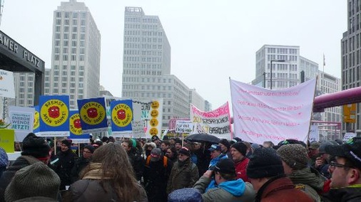 Es war eine ungemütliche Demonstration, aber es ging um ein wichtiges Thema: die Energiewende. Ungefähr 3.000 Demonstranten waren am Dienstag zum Potsdamer Platz in Berlin gekommen, um gegen die aktuelle Energiepolitik der Bundesregierung zu protestieren, bei zwei Grad unter null und zum Teil heftigem Schneefall. Das Motto des Protestmarsches lautete: „Unterm Strich am günstigsten: Erneuerbare Energien“.