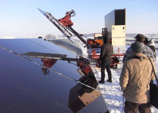 Den ersten gelungenen Einsatz ihres selbst entwickelten Montageroboters meldet die Gehrlicher Solar AG: Der Gehrlicher Assembly Robot, von seinen Kollegen auf der Baustelle Robby genannt, hat beim Bau eines Solarparks im nordsächsischen Sprotta 450 Fullsize-Dünnschichtmodule sicher platziert. Dabei hat Robby, ein Raupenfahrzeug mit Schwenkarm, die Photovoltaik-Module aus den eigens entwickelten Transport-Kassetten gehoben und auf die Unterkonstruktion gelegt. Dank der Schwerkraft sowie mehrerer Backrails auf der Rückseite der Module, die in das mit der Unterkonstruktion verbundene Führungsschiene greifen, sind die zerbrechlichen Riesen dann selbstständig in ihre endgültige Position gerutscht und in die Halteformation eingerastet. Ein manuelles Montieren dieser Module ist fast nicht möglich: Sie haben eine Größe von 5,7 Quadratmetern und ein Gewicht von 120 Kilogramm pro Stück. Von den 450 verlegten Modulen ist, nach Aussage von Gehrlicher, während der automatisierten Montage nur eines zu Bruch gegangen.