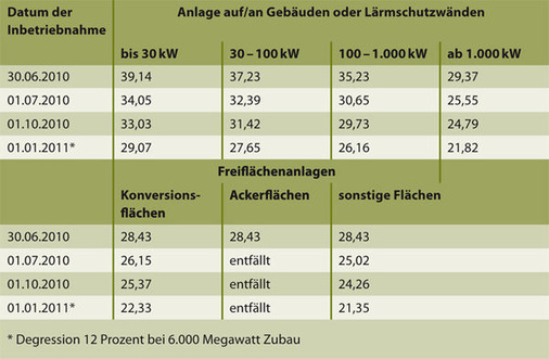 Experten rechnen in diesem Jahr mit einem Zubau von sechs bis sieben Gigawatt in Deutschland. Mit der EEG-Novellierung wurde für die Solarförderung ein „atmender Deckel“, wie ihn Bundesumweltminister Norbert Röttgen (CDU) nennt, etabliert worden. Dies bedeutet, dass sich die Degression der Einspeisevergütung an der neu installierten Photovoltaik-Leistung orientiert. Der Zielkorridor liegt dabei bei einem Zubau von 3500 Megawatt pro Jahr. Wenn dieser überschritten wird, steigt die zum Jahreswechsel gesetzlich verankerte Absenkung der Einspeisetarife für das kommende Jahr pro 1000 Megawatt um ein Prozent. Dies bedeutet, dass bei einer neu installierten Leistung von bis zu 6500 Megawatt in diesem Jahr, die Vergütung für Photovoltaik zum Jahreswechsel nochmals um zwölf Prozent sinken wird. Je nach Größe und Art der Anlage werden die Einspeisetarife dann noch zwischen 21,35 Cent/Kilowattstunde und 29,07 Cent/Kilowattstunde liegen. Dies bedeutet eine Absenkung um bis zu zehn Cent je Kilowattstunde binnen Jahresfrist. Solarpark auf Ackerflächen sind seit dem 1. Juli zudem nicht mehr förderfähig. Es gilt allerdings eine Übergangsfrist für Anlagen, bei denen bis zum 25. März 2010 ein beschlossener Bebauungsplan vorlag. Diese Photovoltaik-Anlagen müssen bis Ende des Jahres ans Netz gebracht werden. Die Betreiber erhalten dann die bis Ende Juni gültige Einspeisevergütung.