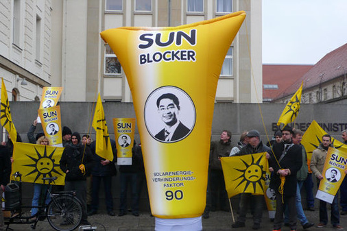 Mehr als 40 Branchenvertreter machten am Freitag ihrem Unmut über die aktuellen Pläne zur Kürzung der Solarförderung von Wirtschaftsminister Philipp Rösler (FDP) Luft. Sie versammelten nach einem Aufruf des Bundesverbands Solarwirtschaft (BSW-Solar) vor dem Bundeswirtschaftsministerium. Sie schwenkten Fahnen, mit traurigen Sonnen darauf. Besonders hervorstechend war eine knapp fünf Meter hohe Tube Sonnencreme, die ein Bild von Philipp Rösler zeigt. Darüber steht in Großbuchstaben „Sunblocker“, darunter „Solarenergie-Verhinderungs-Faktor 90“.