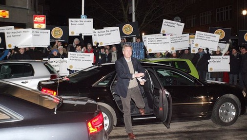 Etwa 100 Mitarbeiter der Berliner Photovoltaik-Firmen IB Vogt, Inventux, Solarpraxis, Solon und Sulfurcell sowie des Bundesverbands Solarwirtschaft haben am Sonntagabend vor dem Bundesarbeitsministerium in Berlin lautstark gegen die geplanten drastischen Kürzungen der Vergütung für Photovoltaik-Anlagen demonstriert. Dort berieten die CDU-Ministerpräsidenten mit der Arbeitsministerin Ursula von der Leyen (CDU) über die Zukunft der Jobcenter. Ziel der Aktion war Teilnehmern zufolge die CDU- Ministerpräsidenten sowie zahlreich anwesende Medienvertreter auf die drohenden Verluste von Arbeitsplätzen und Fertigungsstandorten der deutschen Solarindustrie hinzuweisen. (Karl-Heinz Remmers)
