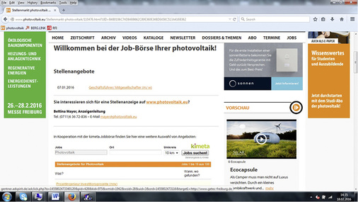 Nach schwierigen Jahren fragen die Solarunternehmen wieder zunehmend nach Fachkräften. Willkommen sind junge Leute und erfahrene Quereinsteiger. Im Projektmanagement, im Vertrieb, in der Entwicklung sowie in der Fertigung sind zahlreiche Stellen unbesetzt. Mit uns können Sie Ihre offenen Stellen bei den Fachzielgruppen ohne Streuverluste platzieren: in der gedruckten Ausgabe und online im Internet. Allein zwischen Ende Januar und Mitte Februar kamen 30 neue Jobs auf unsere Webseite. Informieren Sie sich!
