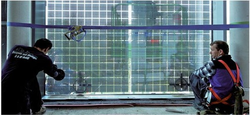 Die Produktion der riesigen Solarelemente für die Südfassade glich einem Experiment. Im Werk des Modulherstellers Ertex im österreichischen Amstetten müssen Module ab 2,50 Meter Breite stehend laminiert werden. In den Glastechnikmaschinen für die Herstellung von Verbundsicherheitsglas geht dies nicht anders. „Wir wussten auch nicht, ob das klappt“, sagt Josef Rechberger von Ertex. „In dieser Größe haben wir das zum ersten Mal gemacht.“ Das größte der Module mit rund zwölf Quadratmetern Fläche hat immerhin 638 Zellen und wiegt über eine Tonne. Die Herausforderung bestehe darin, die große Anzahl von Zellen ohne Bruch aus dem Laminierungsprozess herauszubekommen.
