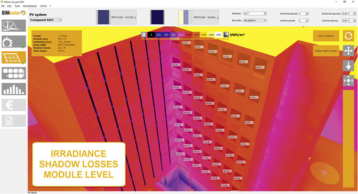 Das französische Start-up Enerbim entwickelt eine ausgeklügelte und zugleich benutzerfreundliche Software zur Planung von Solarfassaden. Herzstück ist die Bestrahlungsanalyse, um Strahlungs- und Schattensimulationen am 3D-Modell durchführen zu können. Jedes Detail der Fassade und die Module selbst können detailliert simuliert werden. Eingebettete Algorithmen liefern Daten zu elektrischen und thermischen Zuständen unter verschiedenen Wetterverhältnissen oder verschiedenen Umgebungsbedingungen. Interessierte Planer können mit einer freien Demoversion die Anwendbarkeit auf ihr konkretes Projekt prüfen.