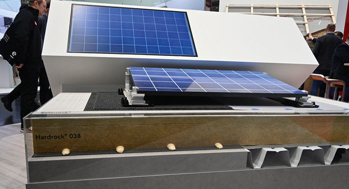Mit Solarrock hat die Deutsche Rockwool eine Dämmlösung für die Installation von Solaranlagen auf Flachdächern entwickelt. Die Solarrock ist eine lastverteilende und begehbare Steinwoll-Dämmplatte mit einer faserverstärkten Beschichtung. Sie wird auf die eigentliche Dämmschicht aufgelegt. Darauf kann wiederum die Solaranlage gestellt werden.