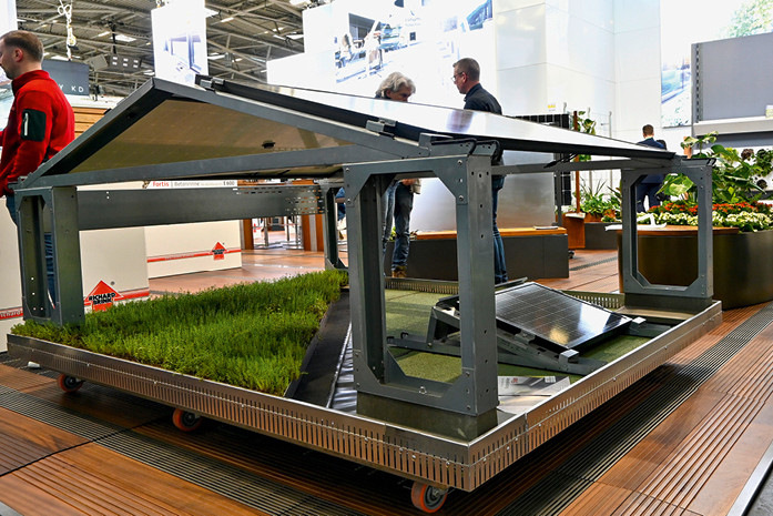 Der norwegische Hersteller Over Easy Solar hat auf der BAU seine Lösung für die vertikale Aufständerung von Solarmodulen auf Gründächern präsentiert. Der Vorteil dabei ist, dass das System sehr schnell montiert ist und die Verschattung der Dachbegrünung im Vergleich zu den flach aufgeständerten Systemen minimiert wurde.