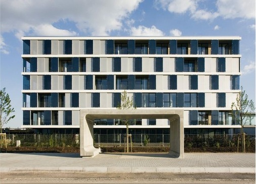 Entstanden sind drei baugleiche Kuben, die auf jeweils fünf Ebenen die Abteilungen für Forschung, Marketing und Vertrieb sowie die Vorstandsbereiche aufnehmen. „Ursprünglich hatten wir drei Gebäude mit unterschiedlichen Geschosszahlen vorgesehen, beginnend mit vier bis zu sechs Geschossen“, erläutert Architekt Uwe Schumann seinen Entwurf. „Da aber das Unternehmen so rasant wächst, haben wir schließlich das Maximum bei allen drei Baukörpern ausgereizt.“ In ringförmiger Anordnung befinden sich Projekt- und Teamarbeitsflächen im Außenbereich, Arbeitsplätze für konzentrierte Einzelarbeit sind um einen kleinen Hof angeordnet. Dazwischen liegt ein multifunktionaler Ring mit frei variierbaren Flächen für Kommunikation, Meeting und anderen Funktionen, etwa Bibliotheken. Den äußersten Ring bildet ein umlaufender Balkon, der von fast allen Büroräumen aus zugänglich ist. Mit einer Höhe von 22 Metern stehen die drei Baukörper exponiert auf freiem Feld umgeben von Produktionshallen. Im Umkreis von mehreren hundert Kilometern sind sie die höchsten Gebäude. In dieser exponierten Lage ist ein verlässlicher Sonnenschutz besonders wichtig. Diesen bietet der offene Umgang mit Holzbelag. Er dient nicht nur der Kommunikation und Auszeit der Mitarbeiter, sondern bildet zugleich eine effektive Klimafassade. Durch die Auskragung von 1,20 Metern verschattet er die Büroräume im Sommer auf natürliche Weise. Zusätzlich sorgen verschiebbare Verschattungselemente für angenehme Innenraumtemperaturen. Als Produzent von kristallinen Solarzellen war der Bauherr daran interessiert, auch am neuen Headquarter sein Produkt gestalterisch einzusetzen und damit das Solarbusiness auch nach außen hin zu demonstrieren. „Wir wollten Solartechnik in der Fassade sichtbar machen,“ sagte Karsten Tietz, Projektmanager bei Q-Cells. Diesen Wunsch griffen die Architekten auf, indem sie die verschiebbaren Verschattungselemente hinter geschosshohen Photovoltaikelementen parken. Jeweils zwei bewegliche Schiebeläden aus Streckmetall können hinter ein Glas-Glas-Modul fahren. Dadurch entsteht eine plastische Fassadenstruktur mit dunklen und hellen Flächen und Rücksprüngen. „Wir hatten uns die Semitransparenz gewünscht. Es ist sehr schön, wenn das Licht zwischen den Zellen hindurchfällt,“ meint Architekt Uwe Schumann. Die Umsetzung der Verschattungselemente war allerdings ein ziemlich langer Prozess. „Es gibt ganz wenige Hersteller, die diese Größe beherrschen.“ Ursprünglich wollten die Leipziger Planer Schiebeläden mit Dünnschichtmodulen der Tochterfirma Calyxo bestücken. Doch diese befinden sich noch in der Pilotphase.