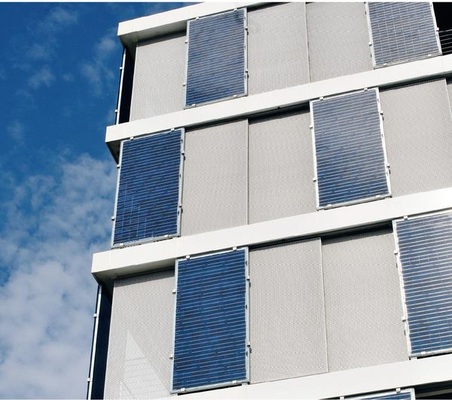 103 Solarmodule, verteilt auf zwei Fassaden, sind nun am Gebäude installiert. „Glas-Glas-Module von Solarnova. Mit 1400 x 2892 Millimetern die größten, die hier in Deutschland montiert wurden“, erklärt Karsten Tietz von Q-Cells stolz. Sie generieren eine grüne Stromkapazität von zirka 48 Kilowattpeak, die in das öffentliche Netz eingespeist werden. Da die Ostseite durch die neu entstehenden Gebäude verschattet wird, sind an der Nord- und Ostfassade die Glaselemente mit Siebdruck optisch an die aktiven Module angepasst. Der Dresdner Ulrich Köhl von der Firma Colt ist verantwortlich für die Ausführung dieser ungewöhnlichen Außenhaut. “Die Architekten hatten sich etwas ausgedacht, das es noch gar nicht gab,“ kommentiert Köhl die Konstruktion der vorgehängten Fassade. „Und das musste in kürzester Zeit umgesetzt werden.“ Die Verschattungselemente sind dreiteilig modular aufgebaut. Jeweils zwei Schiebeläden aus Streckmetall sind einem feststehenden Photovoltaikelement zugeordnet. „Streckmetall als Material ist in dieser Größe für einen beweglichen Sonnenschutz noch nicht eingesetzt worden,“ weiß Köhl aus Erfahrung. Der Antrieb und die mögliche Verformung seien problematisch. Trotzdem ist es ihm gelungen die Steckmetallbahnen auf den Aluminiumrahmen sicher zu vernieten. Auch die riesigen Solarpaneele sind an Aluminiumrahmen befestigt. Standard-Klemmhalter aus Edelstahl fixieren die schweren Glasmodule an den dahinterliegenden Rahmen. Diese Klemmhalter haben sich bereits bei der EWE-Arena in Oldenburg bestens bewährt. Die Laufschienen für die Schiebeläden hat Colt speziell für dieses Projekt gepresst. Trotz der extremen Größe sollten nach Wunsch der Architekten die Fassadenelemente jeweils aus nur einem Modul bestehen. Einen Hersteller zu finden, der Glas-Glas-Module in einer Größe von 1,40 auf knapp drei Meter fertigt, sei nicht einfach gewesen, berichtet Köhl. Alle angefragten Modulhersteller boten Bauteile mit vertikaler Teilung an. „Das war ein no-go für die Architekten“. Schließlich fertigte Solarnova die 136 Kilogramm schweren Module. „Über hundert Solarzellen müssen ohne Bruch eingearbeitet und mit EVA laminiert werden,“ erklärt Heiner von Riegen, einer der Geschäftsführer von Solarnova. „Maximal möglich ist bei uns ein Format von zwei mal drei Metern.“