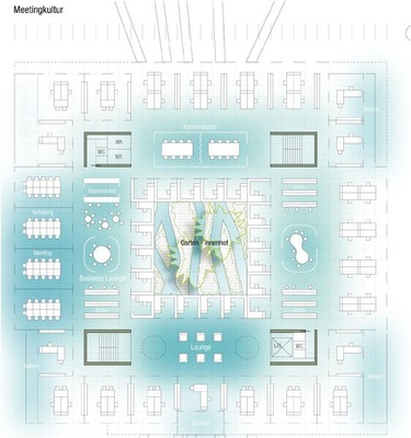 Dicke Luft machte die traurige Berühmtheit Bitterfelds zu DDR-Zeiten aus, von einem gesteigerten Umweltbewusstsein der ortsansässigen Chemieindustrie keine Spur. Nun verhilft die rasant wachsende Solarindustrie dem ostdeutschen Standort zu einem neuen Image. Das Solar Valley im Bitterfeld-Wolfener Ortsteil Thalheim entwickelt sich zu einem der größten Zentren der Solarindustrie Europas. Die Visi onen für den Standort sind nicht gerade bescheiden: 5.000 Arbeitsplätze sollen nach Angaben von Q-Cells bis 2010 auf dem Areal entstehen. Mit ihren Tochterunternehmen ist die Firma Q-Cells maßgeblich für die Entwicklung des 160 Hektar großen Gewerbegebiets verantwortlich. Der Solarzellenhersteller konnte im Jahr 2007 einen Umsatz von über 850 Millionen Euro verzeichnen. Für das seit 2001 stetig wachsende Unternehmen realisiert nun das Leipziger Architekturbüro BHSS das neue Headquarter auf dem Thalheimer Gelände. Neben der Erstellung von Masterplanstudien für das Gewerbegebiet haben die Architekten bereits das Eingangsgebäude sowie die Shuttle-Stationen realisiert. Nun bauen sie drei neue Verwaltungsgebäude für Q-Cells. „Wir sind ein Unternehmen, das schnell wächst. Schaffen sie ganz schnell Arbeitsplätze für 200 Leute,“ lautete anfänglich der Auftrag an die Architekten. Diese nahmen den Arbeitsalltag der Q-Cells-Mitarbeiter genauestens unter die Lupe. Dabei stellten sie fest, dass die innerbetrieblichen Strukturen sich in ständigem Wandel befinden. Gruppen- und Projekt-arbeit in häufig wechselnden Konstellationen seien die notwendige Arbeitsform einer jungen sich dynamisch entwickelnden Branche. Dieser solle auch architektonisch Rechnung getragen werden. „Dafür bedarf es mehr, als der klassischen Meetingräume und Büroarbeitsplätze,“ lautete das Fazit der Planer. Sie integrierten eine große Zahl informeller Treffpunkte in die Bürolandschaft.