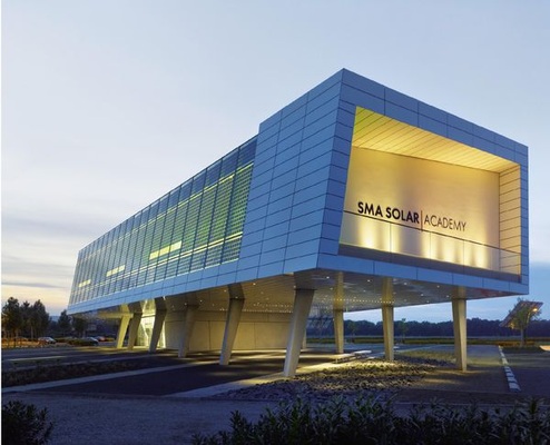 „Das Produzieren von Energie wird eine selbstverständliche Aufgabe von Gebäuden werden“, sagt Günther Schleiff. Photovoltaikbauteile und niedrige Energieverbräuche gehören für den Kasseler Architekten der Planungsgruppe HHS zum Tagesgeschäft. Am Firmensitz des Wechselrichterhersteller SMA in Niestetal hat er ein schräges Seminargebäude entworfen – im wahrsten Sinne des Wortes: Der langgestreckte Baukörper steht auf leicht nach innen gekippten Stelzen. Fassaden und Dachflächen des scheinbar schwebenden Volumens neigen und verkanten sich gegeneinander. Aber das eigentlich Besondere ist: Die Solarakademie versorgt sich selbst mit Strom. Beleuchtung, Frischluftzufuhr, Beamer und 120 Laptops für die Schulungsteilnehmer funktionieren unabhängig vom öffentlichen Netz.
