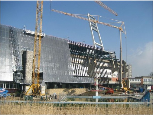 Zügig erklimmt Michaela Wiesing das Baugerüst an der Ostfassade des Stadions. In 20 Meter Höhe steigt die große, blonde Frau über Bündel von Kabelsträngen, die sich provisorisch über die Dachfläche nach unten zu den Einspeisepunkten ziehen. Die gelernte Architektin ist die verantwortliche Photovoltaikplanerin der Firma Solar Engineering aus Hannover, die die Anlage im Auftrag der Investoren geplant hat. „Der erste Bauabschnitt wird gerade abgeschlossen“, erklärt die 39-Jährige. Anfang 2011 sollen Stadion und Photovoltaikanlage dann komplett fertiggestellt sein.