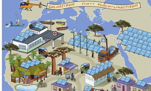 Angesichts der Flüchtlingswelle hat unser Cartoon aus der Juniausgabe doppelte Brisanz. Wollen Sie mit dieser Botschaft in Ihrer Werkstatt oder Ihrem Büro für Photovoltaik werben? Wir senden Ihnen auf Wunsch ein druckfähiges PDF in A3 – das ist unser Weihnachtsgeschenk für Sie!Einfach anfordern per E-Mail: redaktion@photovoltaik.eu