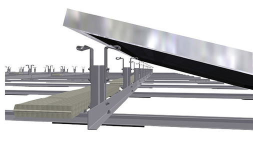 Altec präsentiert ein Flachdach-Montagesystem, das für die Ost-West-Aufständerung konzipiert ist. Der Anpressdruck des Windes sowie eine gezielte Ballastverteilung sorgen dafür, dass das System auch ohne Verschrauben oder Verkleben über einen festen Halt verfügt. Der Dachrandbereich lässt sich bis zu einer Entfernung von 50 Zentimetern vom Dachrand mit Modulen bestücken. Geliefert wird das System in fertigen Baugruppen, am Einsatzort sind nur noch die vormontierten Modulhalterungen auf die Querschienen zu schrauben. Die Module werden dann mit einer Neigung von 15 Grad angebracht. Die Hinterlüftung sorgt dafür, dass auch bei heißem Sommerwetter die Modulleistung nicht beeinträchtigt wird. Da die Konstruktion laut Herstellerangaben nur eine Auflast von 15 Kilogramm pro Quadratmeter aufs Dach bringt – je nach örtlichen Gegebenheiten –, eignet sie sich auch für Leichtbaudächer. Auf statisch berechnete Komplettsysteme gewährt das Unternehmen circa zehn Jahre Garantie.