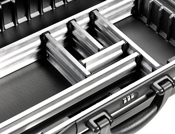 Die Werkzeugkoffer-Manufaktur B & W International aus dem westfälischen Ibbenbüren stattet die Bodenschalen ihrer Werkzeugkoffer mit einem neu entwickelten Trennsystem aus Aluminium aus. Die Trennstege sind schmaler als die herkömmlichen Trennsysteme aus glasfaserverstärktem Kunststoff und bieten den Anwendern dadurch mehr Spielraum für die Aufteilung des Werkzeugkoffers. Der Platz in der Bodenschale kann so optimal ausgenutzt werden. Selbst kleine Einteilungen sind möglich, sodass die Bodenschale auch als Aufbewahrungsfach für Kleinteile dient. Mithilfe einer Puksäge werden die Trennelemente angepasst. Der Vorteil: Durch formbeständiges Aluminium ist auch beim Transport von schwerem Werkzeug Stabilität und Ordnung im Werkzeugkoffer gewährleistet. Insgesamt drei Trennstege, sechs Endkappen und vier Mittelkappen inklusive der Schrauben werden mitgeliefert. Zusätzliche Aluminiumstege samt Zubehör können ebenfalls über den Fachhandel bezogen werden. Die Trennstege gibt es in 60 und 70 Millimetern Höhe.
