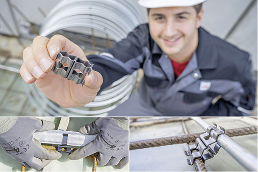 Dazu kommt eine Gewichtsreduzierung. Die Klemme trägt bei Oberbewehrungen nur wenig auf, sodass eine Betonüberdeckung ausreichend sein kann. Blitzstromgeprüft nach DIN EN 62561-1 bietet der Dehnclip damit Sicherheit für alle Erdungs- und Potenzialausgleichsmaßnahmen im Betonfundament. Die Klemme ist für die Verbindung von zehn Millimeter Runddraht und Bandstahl 30 x 3,5 Millimeter mit Armierungseisen zwischen sechs und zwölf Millimeter Durchmesser erhältlich.