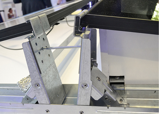 Das System kommt jetzt fast komplett vormontiert auf die Baustelle, und das auch noch in einem relativ kompakten Paket. Denn der Fuß für die Aufständerung der Module ist in die Bodenschiene eingeklappt. Der Monteur legt die Bodenschienen auf der Längsseite der Anlage in der Flucht gerade aus und muss nur noch die Aufständerung ausklappen. Das Scharnier wird durch leichten Druck auf die Mittelstützen fixiert. Danach kann er die Module montieren.