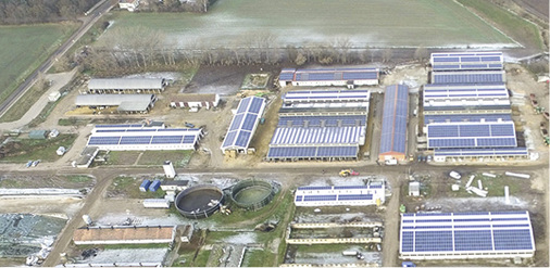 Auf einem landwirtschaftlichen Betriebsgelände in Obhausen in Sachsen-Anhalt ist eine Photovoltaikanlage mit einer Leistung von 1,33 Megawatt entstanden. Verschiedene Montagesysteme von K2 Systems wurden auf mehr als 20 Dächern mit unterschiedlichen Anforderungen und Neigungen verbaut, die insgesamt 4.224 Module tragen. Die Dacheindeckung besteht aus Trapezblech und Wellfaserzement, die Aufständerungswinkel liegen zwischen fünf Grad und 25 Grad Süd- und Ost-West-Aufständerungen. K2 Systems setzte dabei vier verschiedene Systemlösungen ein: Minirail, D-Dome, Stockschraube mit Solidrail und Sonderkonstruktionen.