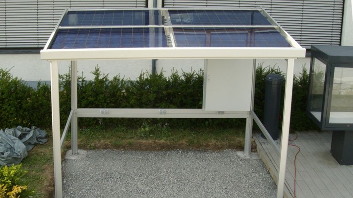 Die tragenden Elemente bestehen aus silbern eloxiertem Leichtmetall, die vier Eckpfosten sind auf Punktfundamenten verschraubt, die 80 Zentimeter weit in den Boden reichen. Die Eindeckung erfolgt mit vier Glasmodulen mit einer Leistung von insgesamt knapp einem Kilowatt.