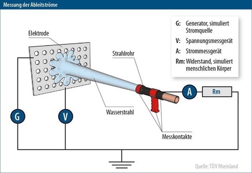 Gemessen wird der Strom bei Einsatz eines Mehrzweckstrahlrohrs. Dieses kann je nach Bedarf einen gezielten Vollstrahl oder einen diffusen Sprühstrahl erzeugen. Entsprechend unterschiedlich sind die fließenden Ströme, beim Vollstrahl höher als bei einem Sprühstrahl. In der Untersuchung ist das Strahlrohr einen Meter von dem stromführenden Gitter entfernt, auf das der Strahl direkt gerichtet ist. Die Untersucher verwenden Wasser ohne weitere Löschzusätze.