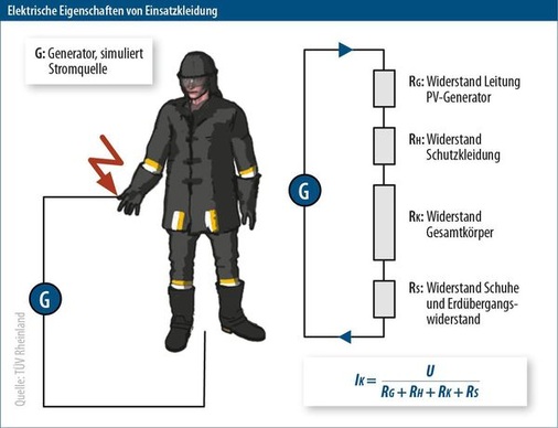 Riskant wird es allerdings, wenn die Rettungskräfte elektrisch leitende Teile direkt berühren. Dies kann leicht vorkommen, wenn die Anlage Strom produziert, nicht abschaltbar ist und beispielsweise beim Brand Isolationen weggeschmort sind. Hier muss die Schutzkleidung ebenfalls helfen. In einem zweiten Versuch experimentieren TÜV und Feuerwehren mit den elektrischen Eigenschaften der Einsatzkleidung unter verschiedenen Bedingungen. Dabei messen sie, welche Gleichströme über Schutzhandschuhe und Stiefel von Hand zu Hand und von Hand zu Fuß fließen.