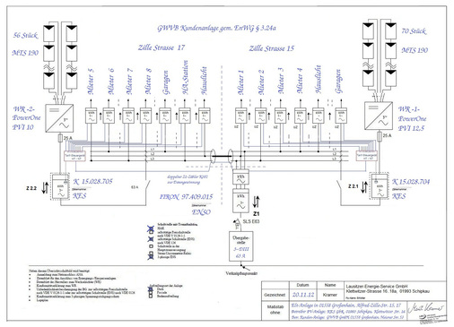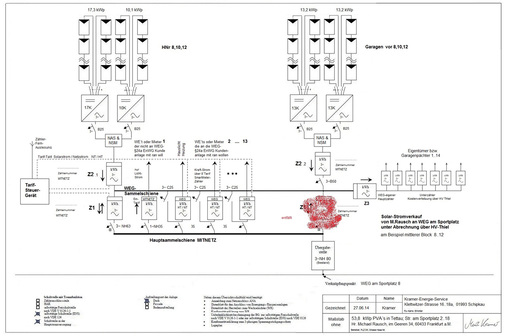 Kramer zieht die Eigentumsgrenze hinter dem Zweirichtungszähler des Energieversorgers, der als Hauptübergabezähler im Schaltschrank des Gebäudes fungiert. Anschließend wird der Strom durch die Unterzähler auf die Mieter verteilt. Die Unterzähler gehören zur Kundenanlage. Weil die vollständige Versorgung mit Sonnenstrom übers ganze Jahr nicht möglich ist, müssen die Mieter in der Nacht oder in sonnenschwachen Monaten Strom aus dem Netz kaufen.