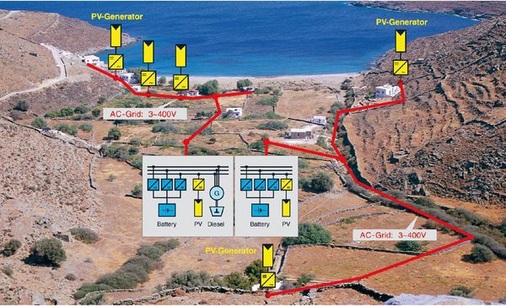 Kythnos – eine von vielen kleinen Inseln der griechischen Ägäis. So weit das Auge blickt, malerische Buchten mit feinstem weißen Sand unter einem strahlend blauen Himmel, hin und wieder weht eine erfrischende Brise. Doch das ist nicht nur die Kulisse für einen traumhaften Urlaub, sondern auch Standort eines erfolgreich laufenden Projektes des Kasseler Instituts für Solare Energieversorgungstechnik ISET. In Zusammenarbeit mit der deutschen Firma SMA und dem griechischen Institut CRES (Center For Renewable Energy Sources) werden auf Kythnos seit 2001 einige Haushalte von Inselsystemen mit Energie versorgt. Die Kleinkraftwerke bestehen aus Wind- und Photovoltaikanlagen, Wechselrichtern, Batteriespeichern und einem Backup-Dieselgenerator auf Drehstrombasis.