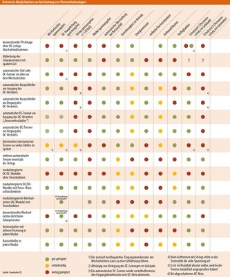Auf dieses Problem sowie auf weitere kritische Details weisen auch die ISE-Wissenschaftler nach einer Analyse der auf dem Markt befindlichen Produkte hin. Grundsätzlich gilt: Jede zusätzliche Maßnahme erhöht die Komplexität einer Photovoltaikanlage und damit sowohl die Kosten als auch die Ausfallwahrscheinlichkeit. Und: Jede Lösung hat Vor- und Nachteile (siehe Tabelle). Der einfache Ansatz beispielsweise, die Modulemit Schaum, Gel oder Planen großflächig lichtdicht abzudecken, gilt laut ISE bislang als technisch nicht zielführend und ist auch aus Sicht der Feuerwehr nicht sinnvoll, da Einsatzkräfte zum Beispiel bei einem Zimmerbrand mit Personengefährdung vorrangig im Gebäude agieren müssen und nicht zuerst auf dem Dach herumhantieren können. Bei thermischen beziehungsweise mechanischen Sicherheitselementen, die sich wie eine Kupplung in jede Standard-Steckverbin