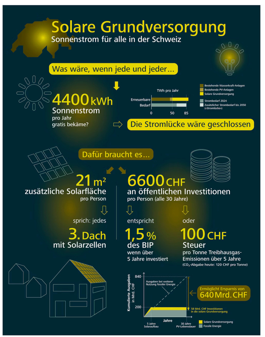 Um in der Schweiz innerhalb von fünf Jahren eine öffentliche Solarversorgung aufzubauen, wäre eine Investition von rund 58 Milliarden Franken (62,25 Milliarden Euro) nötig. Das entspricht etwa einem Prozent des Bruttoinlandsprodukts über fünf Jahre. Amortisiert wäre die Investition bereits innerhalb von sechs bis sieben Jahren nach Inbetriebnahme.