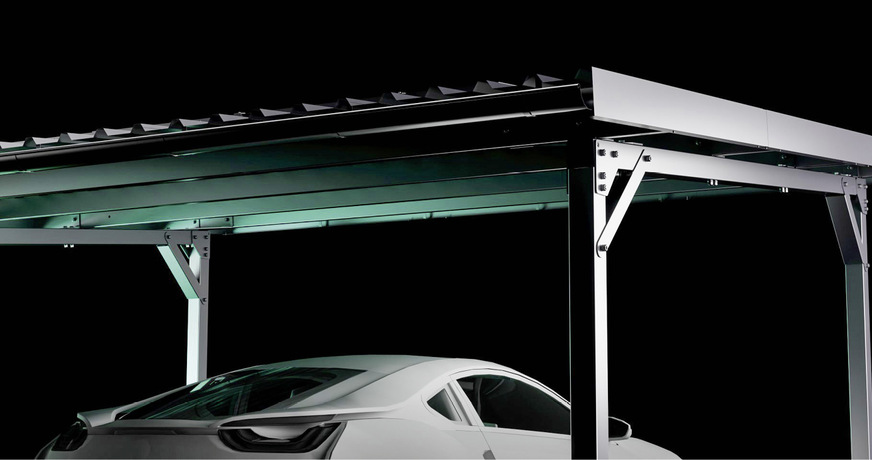 R Plus Custom überdacht nicht mehr nur die Parkplatzreihen, sondern zusätzlich die Fahrrinnen dazwischen. Es ist als Pult- oder Satteldach erhältlich. Diese Konstruktionen stehen auf vier Stützen, an jeder Ecke eine.