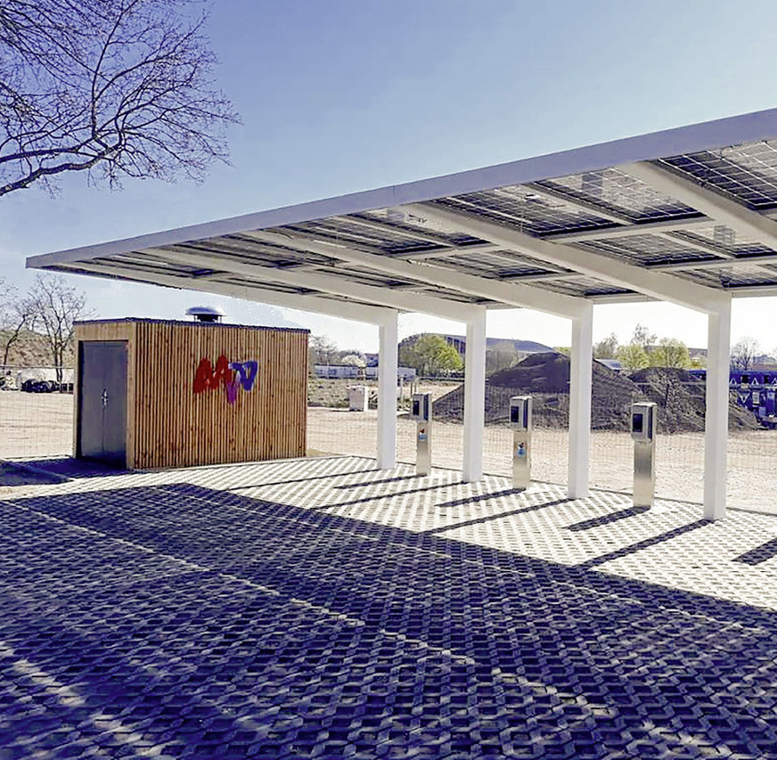 Alle Carports werden mit semitransparenten Doppelglasmodulen ausgestattet. Die Lichtdurchlässigkeit von zwölf Prozent sorgt für ein offenes Design. Die Carports, die als Pultdach ausgeführt sind, haben eine Dachneigung von sechs Prozent. An der Rückseite sind Regenrinnen zum Auffangen von Regenwasser angebracht.
