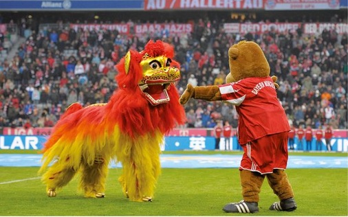 Die einen hielten den zotteligen Vierfüßer mit dem weit aufgesperrten Maul und der roten Schleife in der Mähne für einen Drachen, die anderen konnten den „traditionellen chinesischen Löwen“ darin erkennen. Auf jeden Fall fiel der Tanz auf, den der gelbrot behaarte Löwe mit dem FC-Bayern-Bären in der Halbzeitpause des Spiels München – 1. FC Kaiserslautern Ende Januar aufführte.
