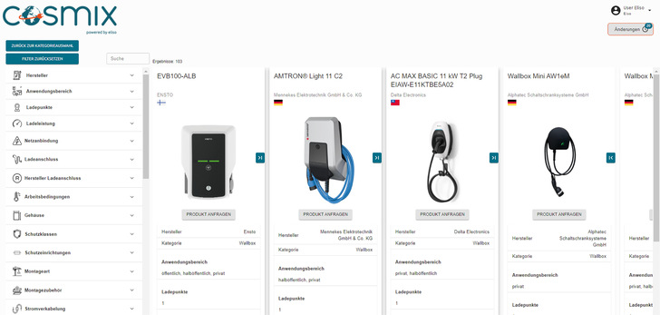 Die Firma Eliso aus Stuttgart hat eine Datenbank namens Cosmix entwickelt, um die wachsende Fülle von Produkten für Ladepunkte zu erfassen und zur Auswahl bereitzustellen. Cosmix ermöglicht dem Nutzer, sich einen schnellen Überblick zu verschaffen.