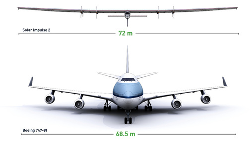Der entscheidende Engpass war die Kapazität des Energiespeichers. Jedes Gramm mehr für die Batterien musste woanders wieder eingespart werden oder es vergrößerte das Flugzeug. Mit acht Metern mehr an Spannweite ist die neue Solar Impulse noch einmal 15 Prozent breiter als ihr Vorgänger. Die Flügel messen insgesamt 72 Meter, mehr als bei einer Boing 747. Dies war nötig, um den Luftwiderstand zu minimieren und die Fläche für die Solarzellen zu maximieren. Dabei wiegt das gesamte Flugzeug nur 2.300 Kilogramm, also etwa so viel wie ein Auto.