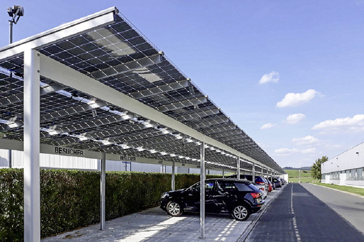 Ein Beispiel ist eine Pultdach-Konstruktion, die aus einem Aluminiumsystem mit teiltransparenten Glas-Glas-Modulen besteht. Durch das Doppelglas sind diese Module besonders resistent gegen Umwelteinflüsse und gewährleisten durch ihre Langlebigkeit einen besonderen Investitionsschutz.