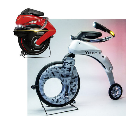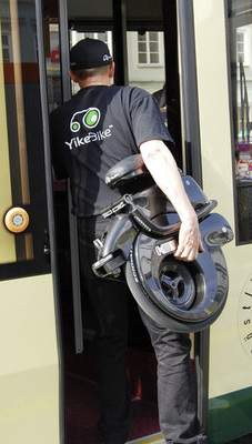 Nicht drei, sondern ein großes und ein winziges Stützrad, dazu ein federleichter Carbon-Rahmen, fertig ist das Yikebike. Ganze elf Kilogramm wiegt das Gefährt und ist damit gerade so schwer wie ein Rennrad. Das Yikebike lässt sich mit etwas Übung innerhalb von 15 Sekunden auf 60 Zentimeter Höhe und 60 Zentimeter Breite bei 15 Zentimetern Tiefe zusammenfalten. Dafür kommt der Fahrer damit aber auch nur acht Kilometer weit, dann muss das Yikebike wieder an die Steckdose. In 20 Minuten ist es zu 80 Prozent aufgeladen.