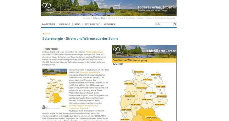 Um die genaue Entwicklung in den Bundesländern nachvollziehen zu können, braucht es aktuelle und vergleichbare Daten und Statistiken. Das Portal Föderal-Erneuerbar liefert eine Zahlen zum Ausbau Erneuerbarer in Form interaktiver Karten und Diagrammen. Zudem gibt es Nachrichten aus den Landeshauptstädten und Best-Practice-Beispiele. In der Übersichtskategorie „Auf einen Blick“ finden sowohl Einsteiger einen guten ersten Überblick zur Entwicklung des jeweiligen Themas auf Länderebene als auch Experten eine übersichtliche Zusammenfassung der angebotenen Zahlen und Fakten. Mit dem neuen Angebot erfährt man schnell, welches Bundesland den meisten Ökostrom erzeugt oder welche Region besonders von den Beschäftigungseffekten Erneuerbarer profitiert. (nhp)