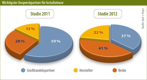 Diese und weitere Fragen haben wir den Solarinstallateuren in unserer großen Marktumfrage gestellt, die auch die Basis ist für unsere aktuelle Studie „Marktstrategien für den Erfolg in der Photovoltaik“ ist. Dabei wird deutlich, dass die Installateure ihre Großhandelspartner zu schätzen wissen. Bei der Frage, wessen Unterstützung am wichtigsten ist in der täglichen Arbeit, wählen 37 Prozent die Großhandelspartner und nur 22 Prozent den Hersteller. 41 Prozent entscheiden sich salomonisch für beide, je nach Bedarf. Interessant allerdings, dass im Jahr 2011 auf die gleiche Frage noch 59 Prozent der Installateure für den Großhandelspartner stimmten.