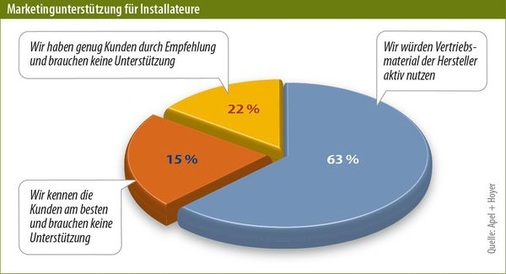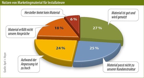 Allerdings hat der Installateur die geringsten Mittel und Ressourcen für eine gute Kundenansprache. Da sind die Hersteller und Großhandelspartner gefordert, die Installateure mit gutem Material und ansprechenden Kampagnen zu unterstützen. In der Befragung geben 63 Prozent der Installateure an, dass sie angebotenes Material aktiv nutzen würden. Sie sind in der Regel sogar bereit, sich an den Kosten zu beteiligen. Allerdings mangelt es bislang an geeignetem Marketingmaterial. Nur 27 Prozent der Installateure sagen, dass das angebotene Material gut ist und genutzt wird. Die restlichen beklagen, dass es nicht zu den von ihnen adressierten Kunden passt, dass es die eigenen Ansprüche nicht erfüllt oder aber der Aufwand für die Anpassung des Materials zu hoch ist.