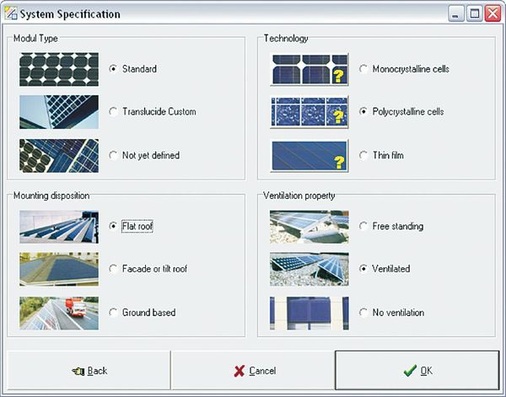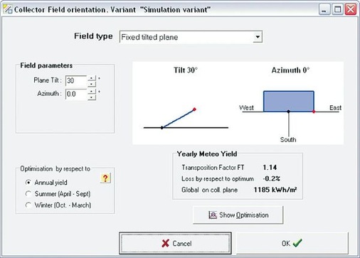 Das Programm besitzt Schnittstellen zu anderen Simulationswerkzeugen, wie zum Beispiel der Software Meteonorm (siehe PHOTOVOLTAIK, Ausgabe 11/2007), so dass der Im- und Export von Daten in PVsyst komfortabel möglich ist. Zur Software gehören außerdem eine Reihe interessanter Teilprogramme („Tools“), wie zum Beispiel eine 3D-Berechnung der Objektverschattung zur Analyse von Schattenwürfen durch nahestehende Objekte. Daneben gibt es eine Möglichkeit zum Import tatsächlich gemessener Anlagendaten für einen direkten Vergleich zwischen simulierten und gemessenen Werten. Weitere Teilprogramme bieten interessante Möglichkeiten zur Untersuchung „solarer Geometrien“, wie zum Beispiel des Verschattungswinkels bei Flachdachmontage oder der Strahlung auf geneigte Flächen.Um eine netzgekoppelte Photovoltaikanlage zu simulieren, muss der Nut zer nur die gewünschte Anlagenleistung eingeben und die gewünschten Solarmodule und Wechselrichter aus der mitgelieferten Produktdatenbank auswählen. Das Programm errechnet die Zahl der benötigten Wechselrichter und schlägt ein geeignetes Anlagenlayout (Verschaltung der Module in Reihe und parallel) vor. Bei diesem Vorschlag werden die technischen Parameter der Module und Wechselrichter berücksichtigt, so dass beispielsweise die Zahl der Module in Reihe zum MPP-Spannungsfenster des Wechselrichters passt. Unabhängig von dem Vorschlag des Programms kann der Nutzer das vorgeschlagene Anlagenlayout modifizieren. Auch dabei erhält er die Unterstützung der Software, die entsprechende Warnhinweise ausgibt, wenn die Anlagenauslegung nicht zufriedenstellend ist.