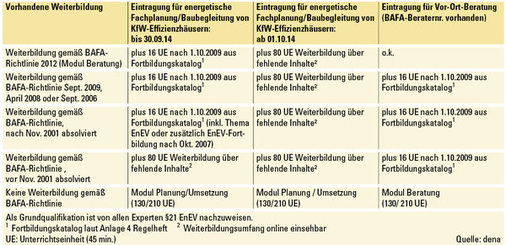 Wer bisher noch nicht auf der Expertenliste aufgeführt ist, aber eine Weiterbildung zum Bafa-Berater nach der Richtlinie der Vor-Ort-Beratung ab November 2001 abgeschlossen hat, sollte unbedingt die Übergangsregelung für die Aufnahme in die Liste beachten. Die Regelung hätte eigentlich am 31. Dezember 2013 geendet, wurde aber bis 30. September 2014 verlängert. Innerhalb dieser Frist müssen diese Berater lediglich 16 Unterrichtseinheiten aus dem Bereich energiesparendes Bauen und Sanieren nachweisen. Ab Oktober 2014 sind hingegen 80 Einheiten nachzuweisen.