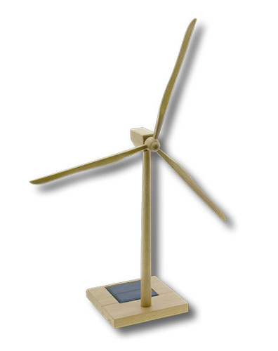 Die aus Holz gearbeitete Solar-Windanlage dreht dank eingebautem Getriebe mit realistischen 18 Umdrehungen pro Minute.