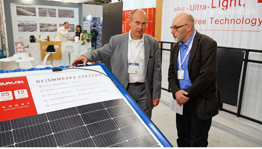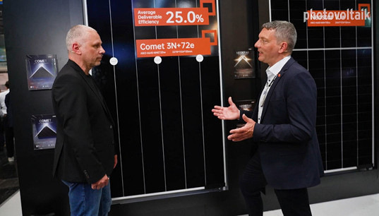 Außerdem wurde eine neue bifaziale Glas-Glas-Modulreihe mit G12R-Zellen (182,2 mal 210 Millimeter) mit 610 Watt präsentiert. Dieses Modul ist gleichfalls für Solarparks geeignet.