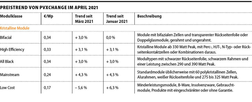 Die Preise stiegen durchschnittlich um 0,5 bis ein Cent pro Watt gegenüber Februar 2021. Gegenüber der Mitte des vierten Quartals 2020 stiegen die Preise im Durchschnitt gar um zwei bis drei Cent. Das entspricht beim aktuellen Preisniveau zwischen zehn und 15 Prozent und ist in vielen Projekten kaum zu kompensieren.