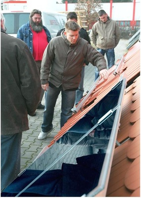 Draußen zieht sich der solare Carport fast ebenso lang wie die Fensterfront des Schulungsraums. Der Carport ist eine Spezialentwicklung von MP-Tec. Es regnet nicht. Also raus in den kalten Wind zum Übungspark. Auf aufgestellten Übungsdächern werden Module eingehängt, Dachsteine ab- und aufgedeckt und Sparrenanker ausprobiert. Die Dachdecker sind in ihrem Element und kommentieren mit Sachkenntnis. Bei der Kälte fällt es nicht leicht, die Hand aus der Tasche zu nehmen. Unverdrossen plaudert Kusche über Erfahrungen mit verschiedenen Modulen, Dächern, Problemen bei Indachanlagen oder Asbestdächern, an die man besser nicht rangehen sollte. Der Mann weiß, wovon er redet. Kusche ist Montage- und Planungsexperte bei der Solarpraxis. Und er hat langjährige Erfahrung in der Photovoltaikbranche, praktisch und theoretisch. Das merkt man.