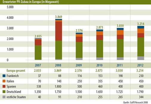 Verantwortlich hierfür ist neben der Finanzkrise vor allem die Deckelung der Förderung in Spanien auf maximal 500 Megawatt im kommenden Jahr – nach einem Zubaurekord von schätzungsweise 1,8 Gigawatt in 2008.